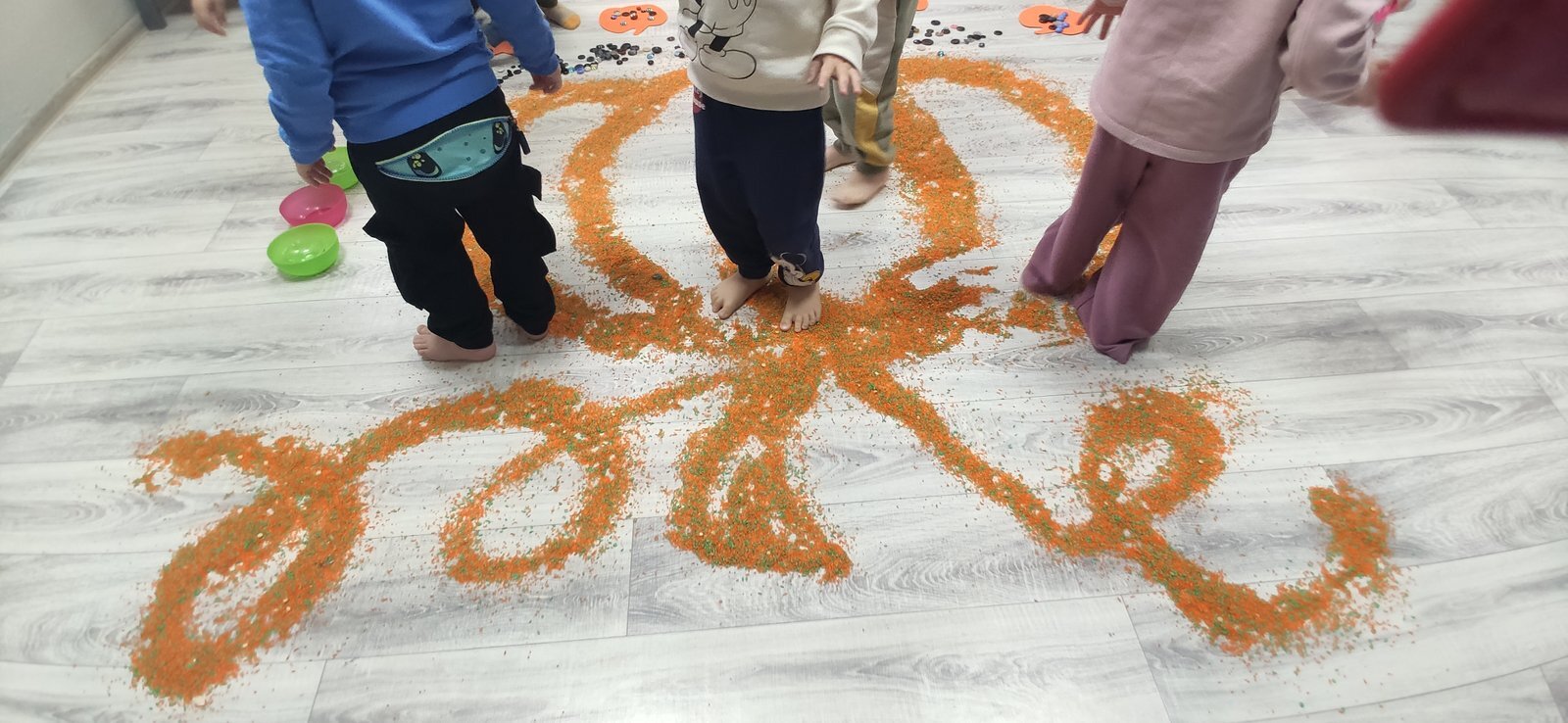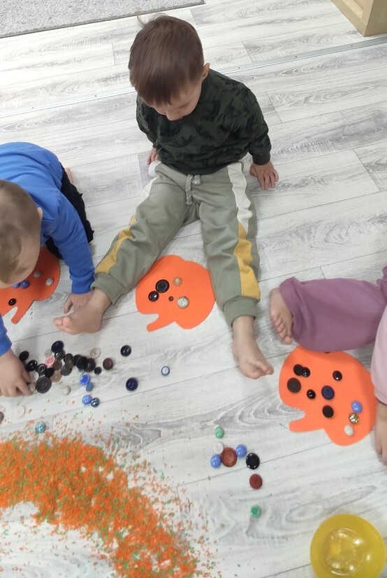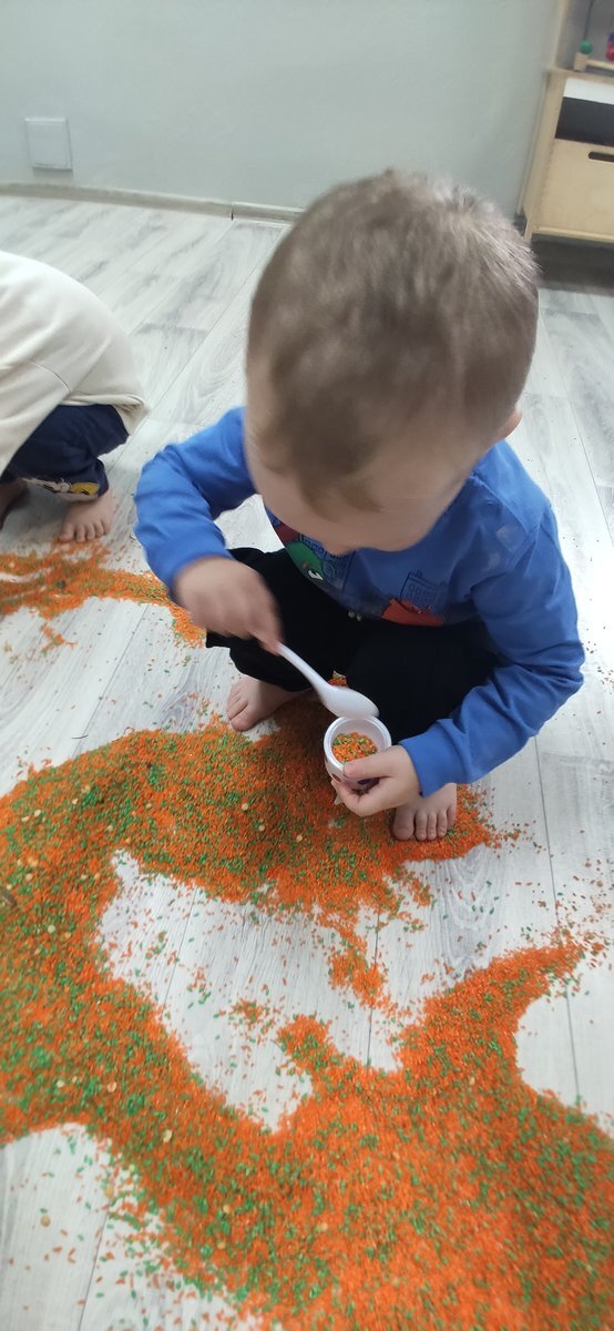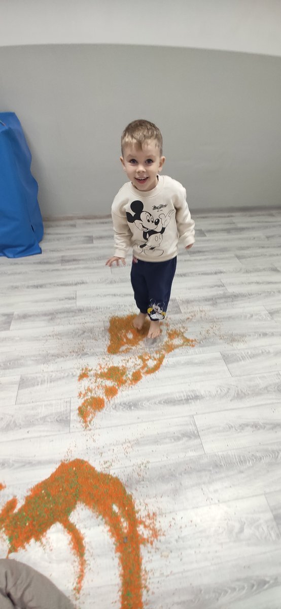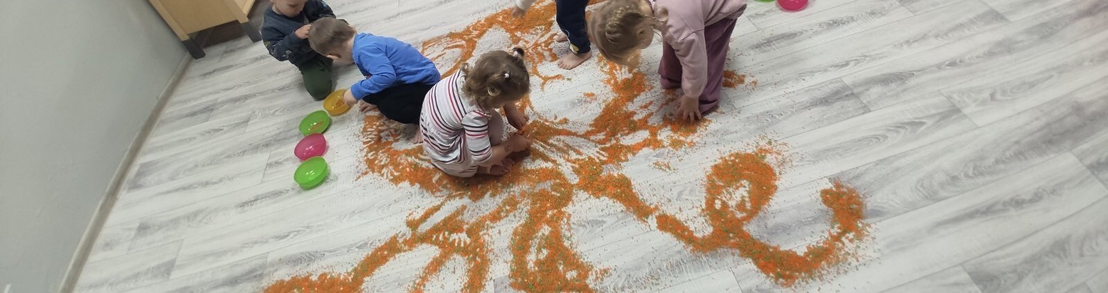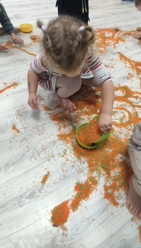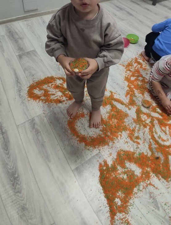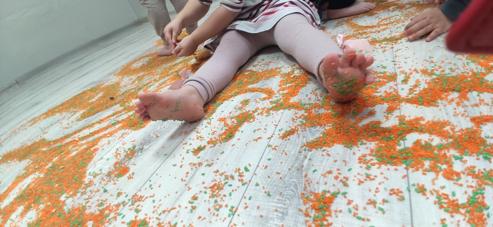 Dzisiejsze zajęcia przyniosły dzieciom mnóstwo radości i wrażeń sensorycznych. Zajączki bawiły się zafarbowanym, kolorowym ryżem – przesypywały go, mieszały, pisały po nim paluszkami oraz chodziły po nim boso. Dzięki temu doświadczały różnorodnych doznań dotykowych – zarówno w rączkach, jak i w stópkach. Zabawa z ryżem rozwijała ich zmysły, małą motorykę oraz kreatywność.